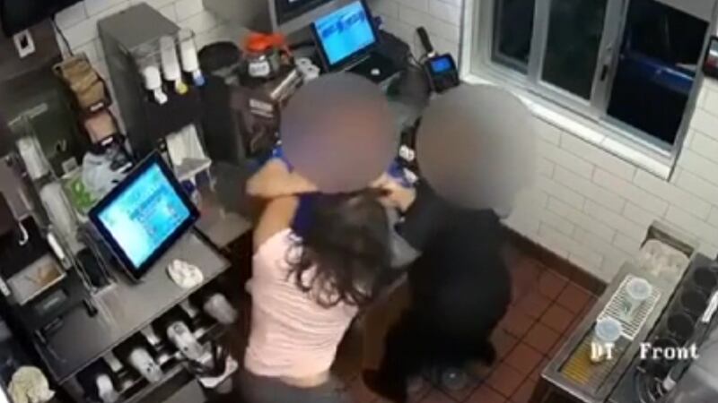 The video shows the suspect, dressed in a light T-shirt, putting her hands around the manager’s neck and slamming her head into a drink machine.