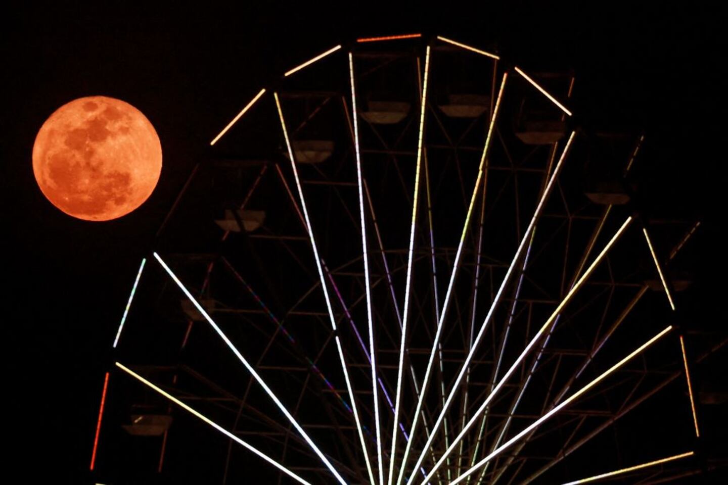 Blue Supermoon A super blue moon rises behind a ferris wheel located at Stokes Hill Wharf in the Northern Territory capital city of Darwin on August 31, 2023. (Photo by DAVID GRAY / AFP) (Photo by DAVID GRAY/AFP via Getty Images) (DAVID GRAY/AFP via Getty Images)