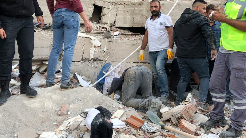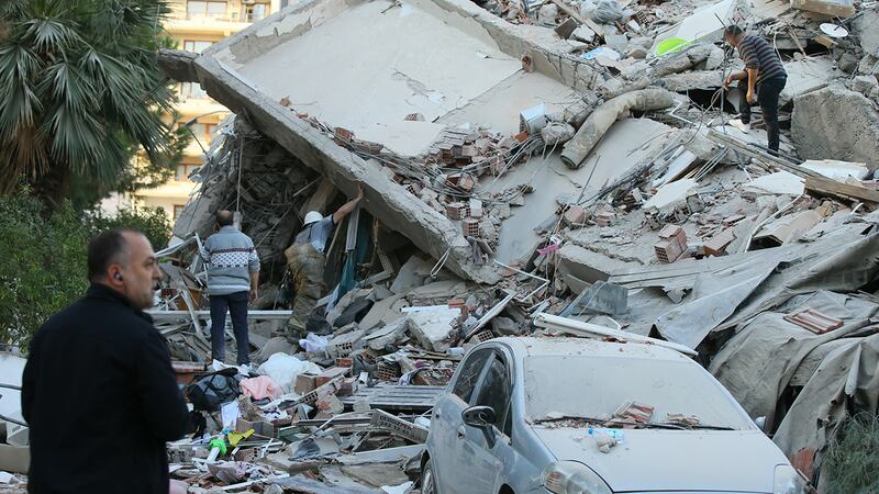 Deadly earthquake shakes Greece, Turkey, destroying buildings Rescue workers and local people try to reach residents trapped in the debris of a collapsed building, in Izmir, Turkey, Friday, Oct. 30, 2020, after a strong earthquake in the Aegean Sea shook Turkey and Greece. (Ismail Gokmen/AP)