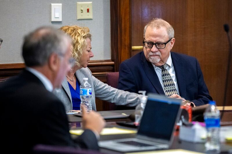 Guilty verdict Defense attorney Laura Hogue, center, touches the hand of her client Greg McMichael, right, while they wait for the jury to come into to the courtroom during the trial of McMichel and his son, Travis McMichael, and a neighbor, William "Roddie" Bryan in the Glynn County Courthouse, Wednesday, Nov. 24, 2021, in Brunswick, Ga. The three are charged with the February 2020 slaying of 25-year-old Ahmaud Arbery. (AP Photo/Stephen B. Morton, Pool) (Stephen B. Morton/AP)