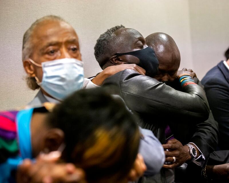 Guilty verdict Ahmaud Arbery's father Marcus Arbery, center, his hugged by his attorney Benjamin Crump after the jury convicted Travis McMichael in the Glynn County Courthouse, Wednesday, Nov. 24, 2021, in Brunswick, Ga. (AP Photo/Stephen B. Morton, Pool) (Stephen B. Morton/AP)