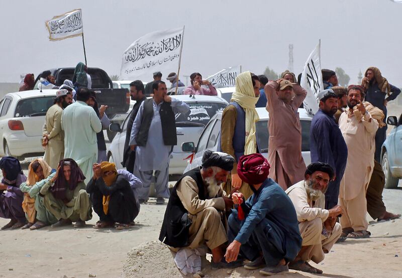 Afghanistan takeover People near Taliban signature white flags wait for the arrival of their relatives, who were reportedly released from prison by the Taliban in Afghanistan, at a border crossing point, in Chaman, Pakistan, Tuesday, Aug. 17, 2021. (AP Photo/Jafar Khan) (Jafar Khan/AP)