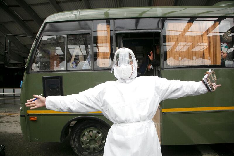 Afghanistan takeover A Nepalese army man in protective gear gestures to show the bus waiting for Nepalese people evacuated from Afghanistan as they arrive via Kuwait at the Tribhuvan International Airport in Kathmandu, Nepal, Tuesday, Aug. 17, 2021. (AP Photo/Niranjan Shrestha) (Niranjan Shrestha/AP)