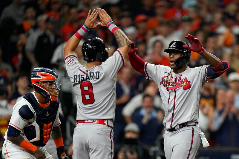 Atlanta Braves win 2021 World Series Atlanta Braves' Ozzie Albies singles during the third inning in Game 6 of baseball's World Series between the Houston Astros and the Atlanta Braves Tuesday, Nov. 2, 2021, in Houston. (AP Photo/Sue Ogrocki) (Sue Ogrocki/AP)