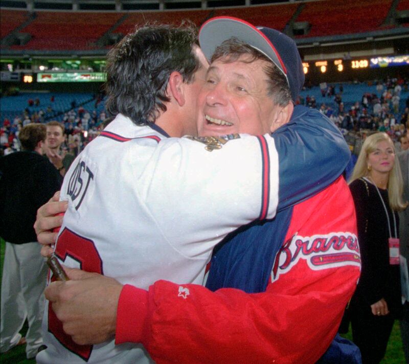 Photos: Remembering the Atlanta Braves' 1995 World Series win In this Oct. 28, 1995, file photo, Atlanta Braves manger Bobby Cox, right, hugs bullpen coach Ned Yost after the Braves' 1-0 victory over the Cleveland Indians in Game 6 of the World Series in Atlanta. (AP Photo/John Bazemore, File)