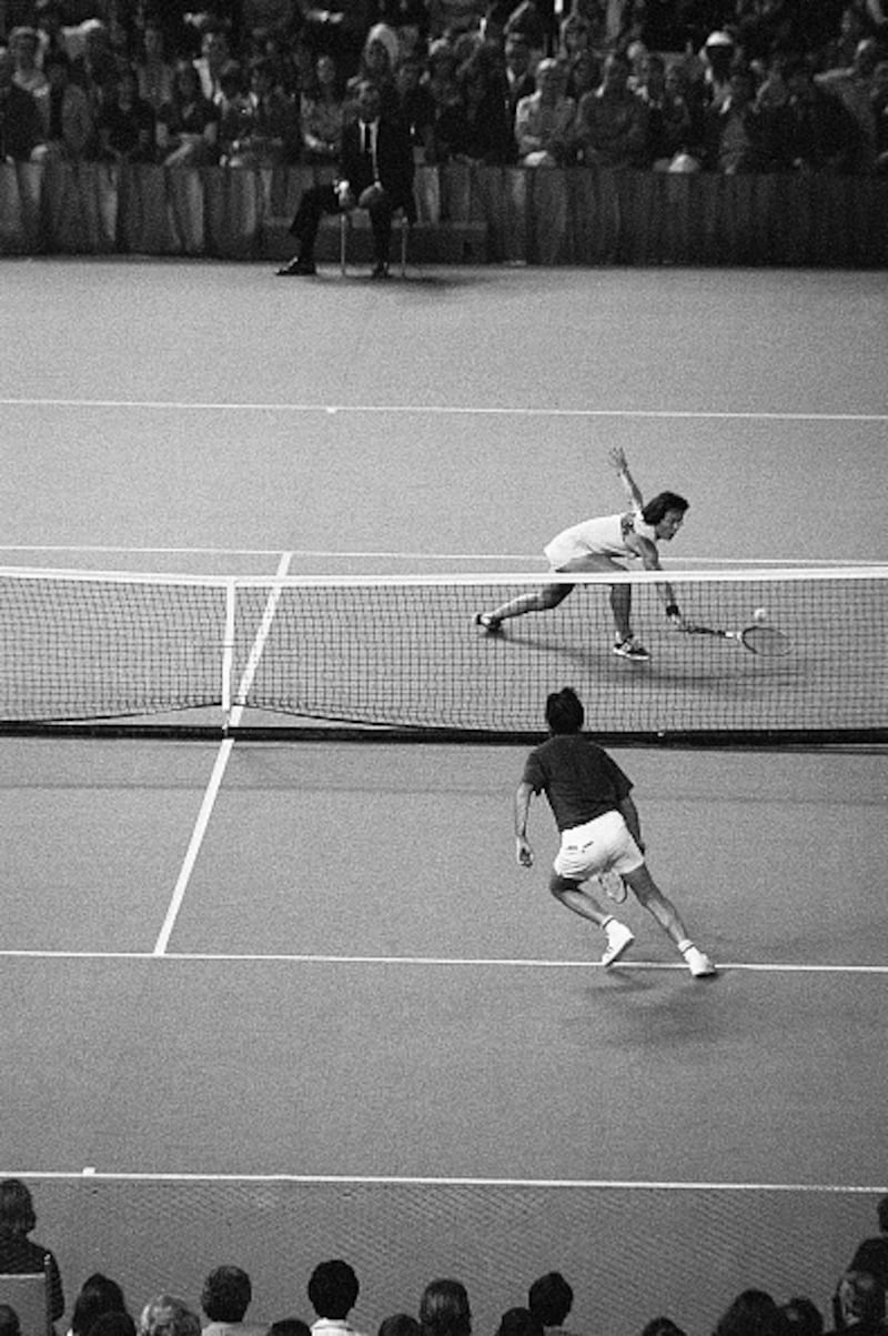 Battle of the Sexes 20 Sep 1973: Bobby Riggs of the USA in action during a Battle of the Sexes Challenge Match against Billie Jean-King of the USA held at the Astrodome, in Houston, Texas. The battle of the sexes match came about after Bobby Riggs had challenged King to abest of five set match stating no woman could beat him. King therefore proved him wrong and won the match in straight sets with a 6-4, 6-3, 6-3 win. At the time it was watched by the biggest ever audience for a tennis match with a crowd of over 30,472 watching at the arena with another 40 million watching on television sets around the world. \ Mandatory Credit: AllsportUK /Allsport (Getty Images/Getty Images)