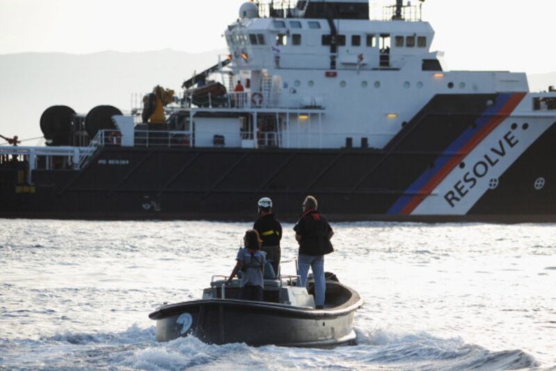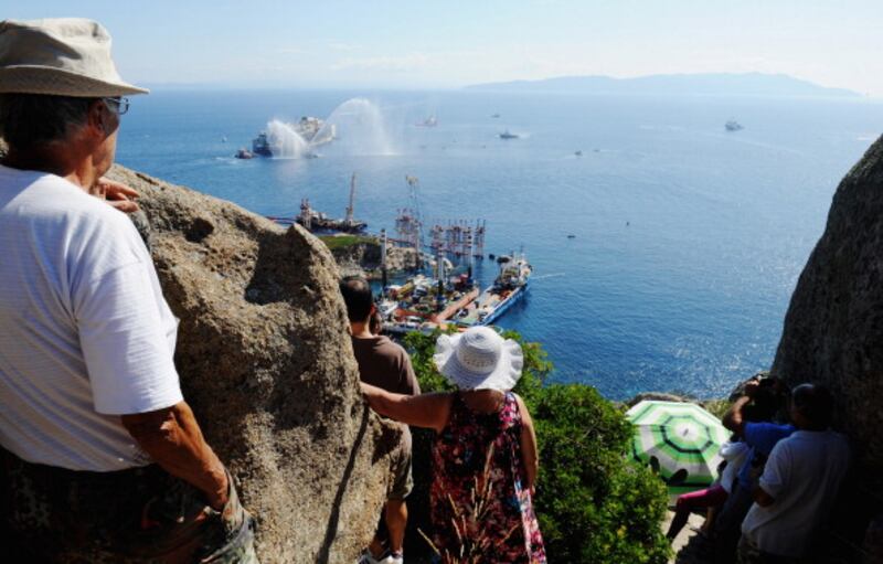 10 years later People watch as the wrecked cruise ship Costa Concordia is towed by tugs from Giglio after being refloated, on July 23, 2014 in Isola del Giglio, Italy. The ship is bound for its home port of Genoa where it will be dismantled. The Costa Concordia capsized at the island of Giglio in 2012 killing 32 passengers. (Photo by Laura Lezza/Getty Images) (Laura Lezza/Getty Images)