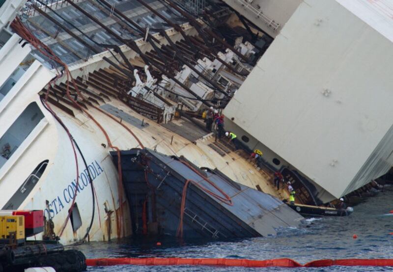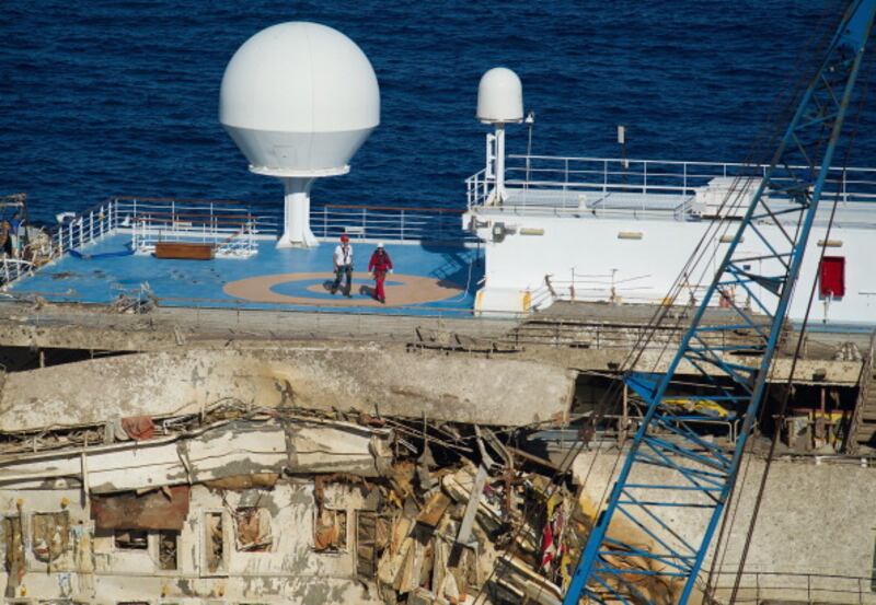 10 years later A team of experts go to inspect the wreck of the ship Costa Concordia on January 23, 2014 in Isola del Giglio, Italy. Today, for the first time since the ship's fatal 2012 accident, a delegation will board the vessel to collect new evidence, among the areas of interest will be the ship's bridge and the on-board elevators with the emergency generator which failed the night of the crash to be inspected on February 27th. (Photo by Laura Lezza/Getty Images) (Laura Lezza/Getty Images)