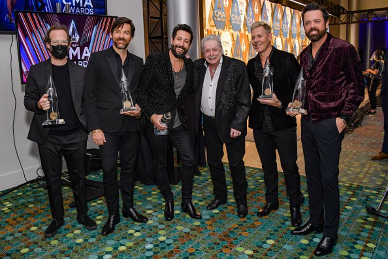Mickey Gilley NASHVILLE, TENNESSEE - NOVEMBER 11: (FOR EDITORIAL USE ONLY) (L-R) Whit Sellers, Geoff Sprung and Matthew Ramsey of musical group Old Dominion, Mickey Gilley, Trevor Rosen and Brad Tursi of musical group Old Dominion attend the 54th annual CMA Awards at the Music City Center on November 11, 2020 in Nashville, Tennessee. (Photo by Jason Kempin/Getty Images for CMA) (Jason Kempin/Getty Images for CMA)