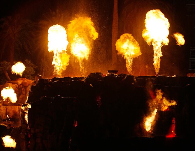 The Mirage LAS VEGAS - DECEMBER 11: The newly-redesigned volcano attraction in front of The Mirage Hotel & Casino erupts December 11, 2008 in Las Vegas, Nevada. The $25-million renovation features 150 choreographed FireShooters sending fireballs more than 12 feet in the air and a custom soundtrack created by Grateful Dead drummer Mickey Hart and Indian tabla virtuoso Zakir Hussain. (Photo by Ethan Miller/Getty Images for MGM Mirage) (Ethan Miller)