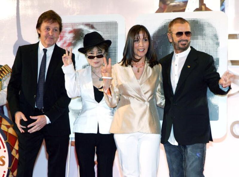 The Mirage LAS VEGAS - JUNE 26: (L-R) Sir Paul McCartney, Yoko Ono, Olivia Harrison and Ringo Starr pose during a commemorative plaque dedication ceremony for John Lennon and George Harrison as part of the first anniversary celebration of "The Beatles LOVE by Cirque du Soleil" show at The Mirage Hotel & Casino June 26, 2007 in Las Vegas, Nevada. (Photo by Ethan Miller/Getty Images) (Ethan Miller/Getty Images)