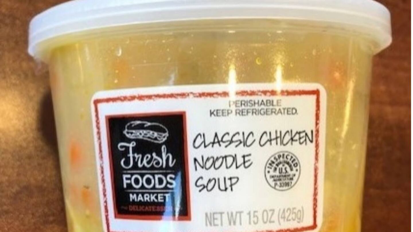 - 15-ounce plastic cups containing “FRESH FOODS MARKET CLASSIC CHICKEN NOODLE SOUP” with a best by date of 6/9/2020 and lot Code 425798031120.