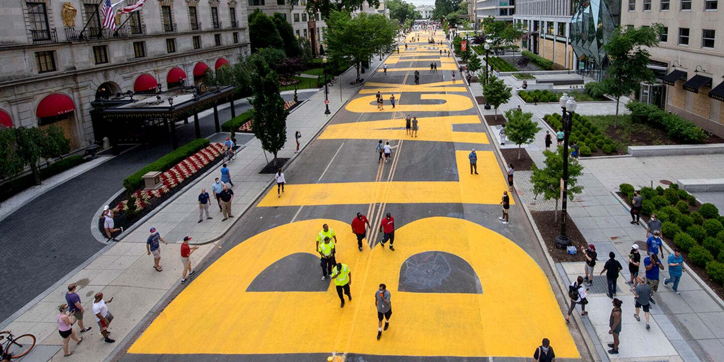 City workers and local artists painted the street that leads to the White House with “Black Lives Matter” in bright yellow letters. The mural stretches across the entire width of 16th Street to the north of Lafayette Square and ends near St. John’s Episcopal Church.
