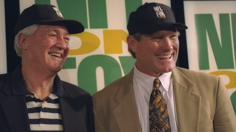 1994 FOX Sports commentators Pat Summerall (left) and Terry Bradshaw look on at a press conference before Super Bowl XXVIII between the Dallas Cowboys and the Buffalo Bills at the Georgia Dome in Atlanta, Georgia. The Cowboys won the game, 30-13 (Stephen Dunn/Getty Images)