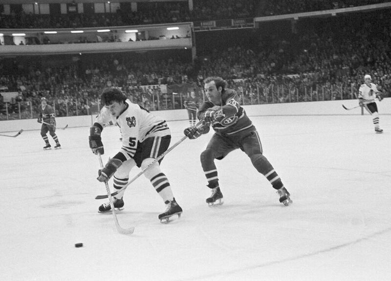 Through the years Guy Lafleur, right, of Montreal Canadiens attempts to deflect stick of Phil Russell of Chicago Black Hawks from puck during NHL action at Chicago, Dec. 8, 1976. (AP Photo/Larry Stoddard) (Larry Stoddard/AP)