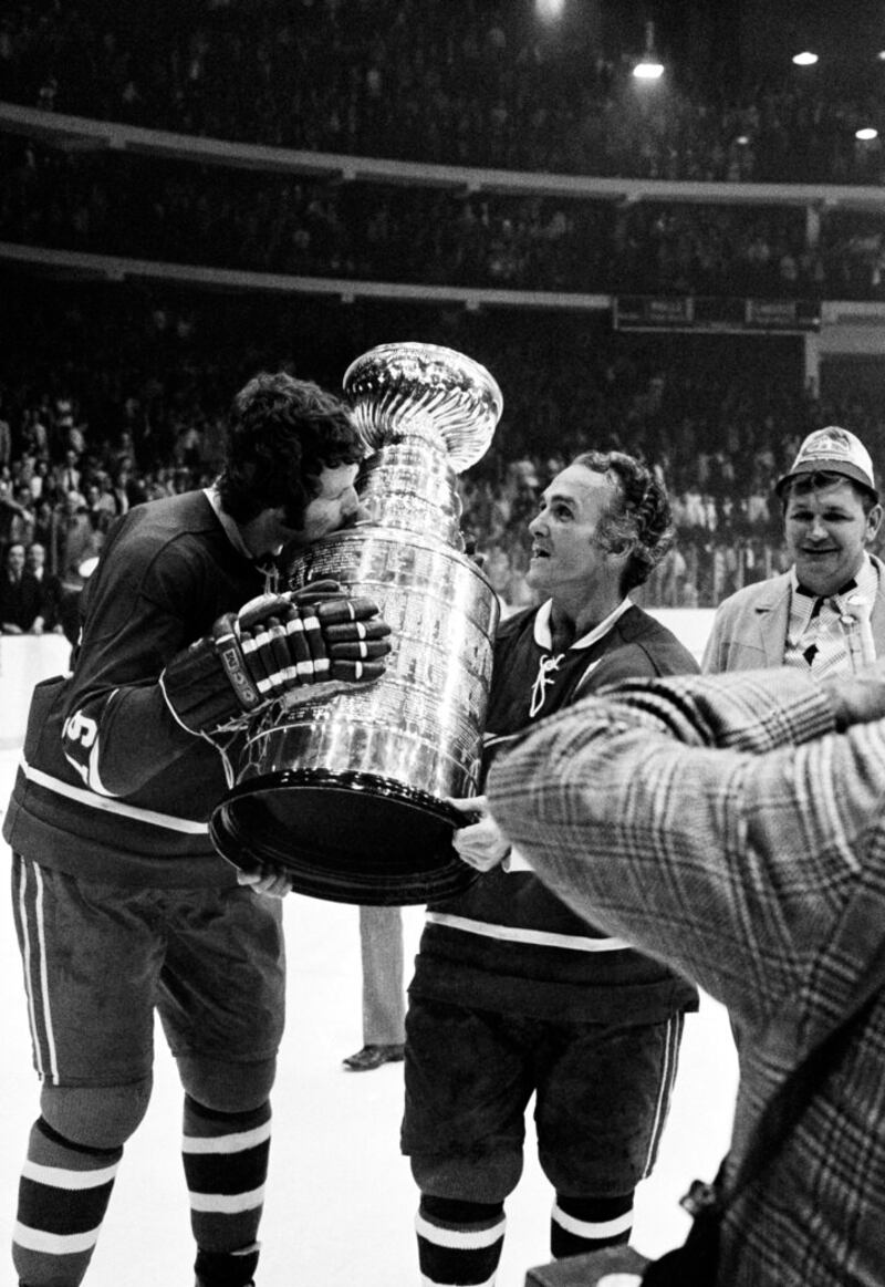 Through the years Montreal Canadien Guy Lafleur kisses the Stanley Cup while Montreal captain Henri Richard holds the cup Thursday night, May 10, 1973 in Chicago. Montreal beat Chicago 6-4 and won the National Hockey League playoff. (AP Photo) (Anonymous/ASSOCIATED PRESS)