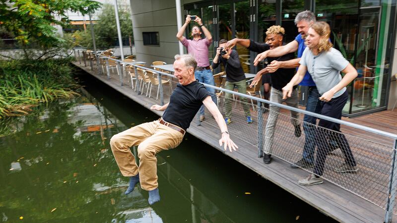 OCTOBER 03 Svante Paabo, Director of the Max Planck Institute for Evolutionary Anthropology, is thrown into a pool of water by her colleagues after a press conference after he won the Nobel Prize in Physiology or Medicine on October 3, 2022 in Leipzig, Germany. Paabo is being recognized for his pioneering work in decoding the genome of Neanderthals and proving a genetic link to modern humans. (Jens Schlueter/Getty Images)