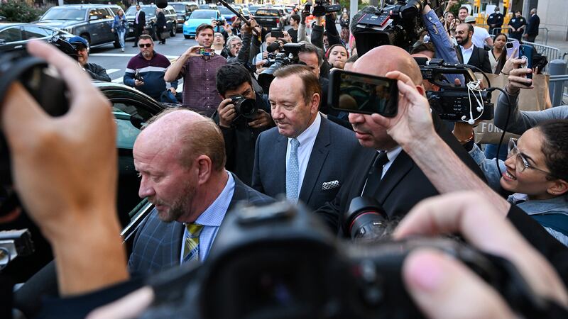 OCTOBER 06 Actor Kevin Spacey is surrounded by members of the media and fans as he leaves the US District Courthouse on October 06, 2022 in New York City. Spacey’s trial began today with jury selection after allegations of alleged sexual misconduct surfaced in 2017 by actor Anthony Rapp. (Alexi J. Rosenfeld/Getty Images)
