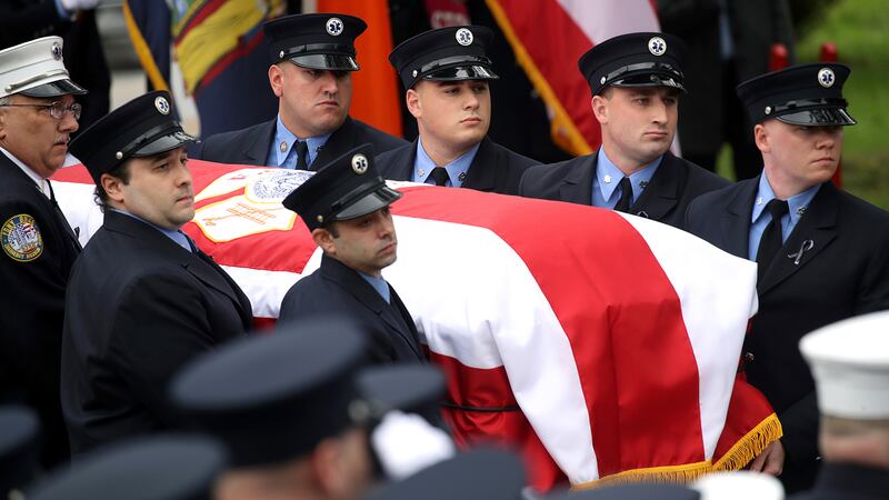 OCTOBER 05 The casket of FDNY Lt. Alison Russo-Elling arrives as hundreds of firefighters, EMS workers and other first responders gather at the Tilles Center for Performing Arts in Long Island for her funeral after she was stabbed in a random attack last week on October 05, 2022 in Brookville, New York. Russo-Elling, 61, a 25-year veteran of the FDNY and 9/11 first responder, was stabbed to death by a stranger near her Astoria, Queens station house. (Spencer Platt/Getty Images)