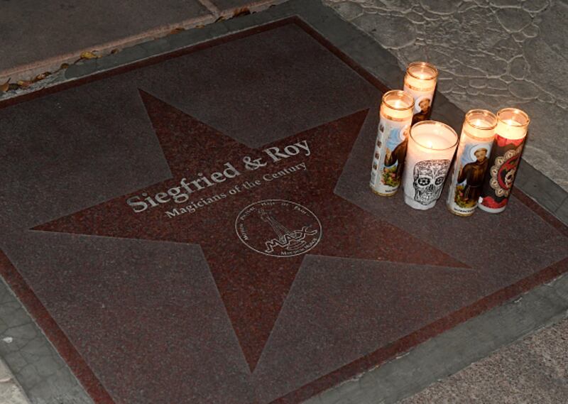 Siegfried & Roy through the years Candles are lit for Roy Horn on a plaque for Horn and his magician partner Siegfried Fischbacher from the Las Vegas Walk of Stars outside The Mirage Hotel & Casino on the Las Vegas Strip after news of Horn's death at the age of 75 from complications from the coronavirus on May 8, 2020 in Las Vegas, Nevada. Horn tested positive for COVID-19 in late April. The illusionist duo Siegfried & Roy headlined at The Mirage from 1990 to 2003, when a white tiger from their show injured Horn, leaving him partially paralyzed. (Photo by Ethan Miller/Getty Images) (Ethan Miller/Getty Images)