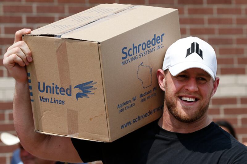 Photos: J.J. Watt through the years 2017: Houston Texans defensive end J.J. Watt holds a box of relief supplies on his shoulder while handing them out to people impacted by Hurricane Harvey on September 3, 2017, in Houston. (Brett Coomer - Pool/Getty Images)
