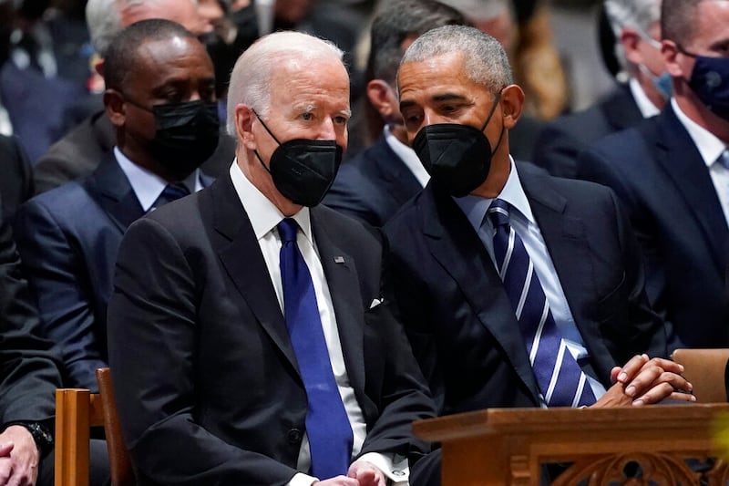 Madeleine Albright memorial President Joe Biden, left, former President Barack Obama, former first lady Michelle Obama and former President Bill Clinton attend the funeral service for former Secretary of State Madeleine Albright at the Washington National Cathedral, Wednesday, April 27, 2022, in Washington. (AP Photo/Andrew Harnik) (Andrew Harnik/AP)
