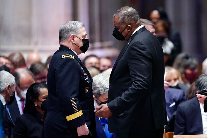 Remembering Madeleine Albright Chairman of the Joint Chiefs of Staff Gen. Mark Milley, left, talks to Secretary of Defense Lloyd Austin as they arrive for the funeral of former Secretary of State Madeleine Albright, at the Washington National Cathedral, Wednesday, April 27, 2022, in Washington. (AP Photo/Evan Vucci) (Evan Vucci/AP)