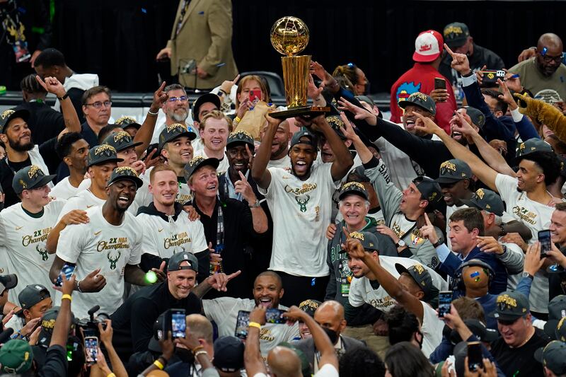 Photos: Milwaukee Bucks defeat Phoenix Suns to win NBA title The Milwaukee Bucks celebrate with the championship trophy after defeating the Phoenix Suns in Game 6 of basketball's NBA Finals in Milwaukee, Tuesday, July 20, 2021. The Bucks won 105-98. (AP Photo/Paul Sancya)