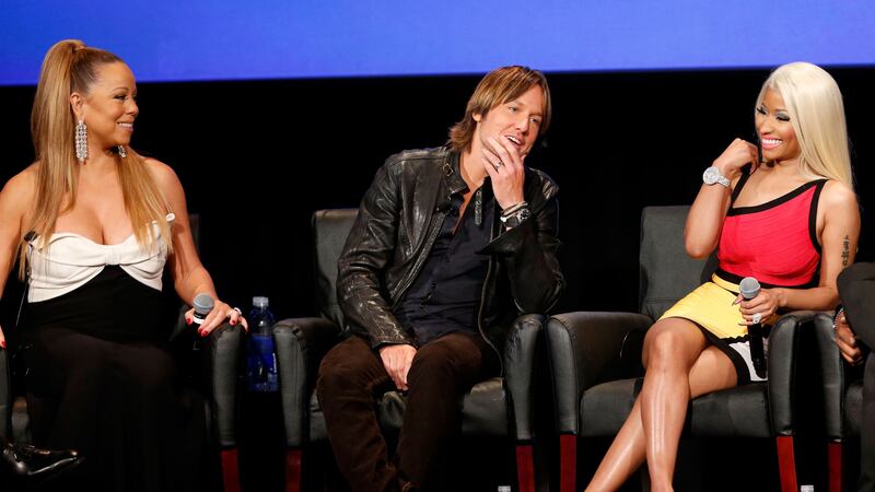 Singer Mariah Carey, musician Keith Urban, and singer Nicki Minaj onstage during a live Q&A during the season premiere screening of Fox's 'American Idol' at Royce Hall, UCLA on January 9, 2013 in Westwood, California. (Imeh Akpanudosen/Getty Images)
