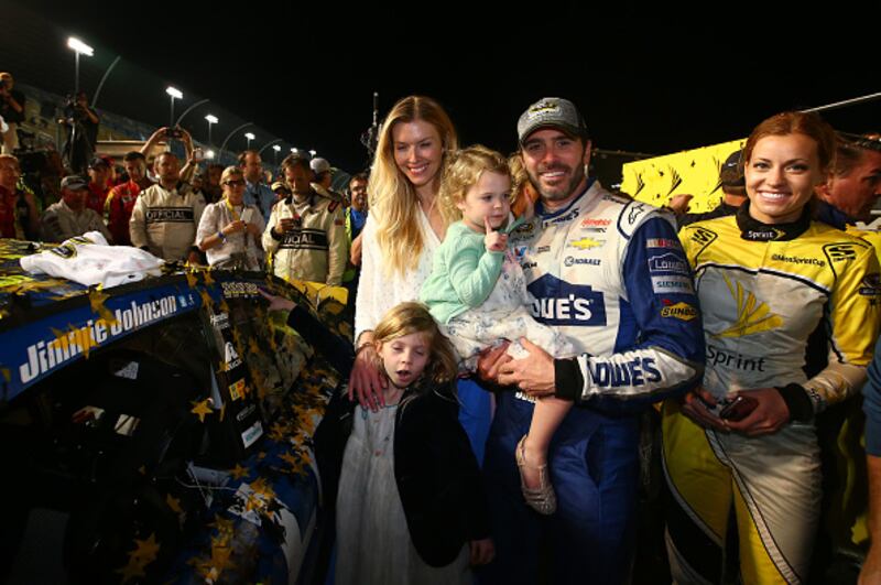 Through the years HOMESTEAD, FL - NOVEMBER 20: Jimmie Johnson, driver of the #48 Lowe's Chevrolet, poses in Victory Lane with his wife Chandra and daughters Genevieve Marie and Lydia Norriss after winning the NASCAR Sprint Cup Series Ford EcoBoost 400 and the 2016 NASCAR Sprint Cup Series Championship at Homestead-Miami Speedway on November 20, 2016 in Homestead, Florida. Johnson wins a record-tying 7th NASCAR title. (Photo by Sarah Crabill/Getty Images) (Sarah Crabill/Getty Images)