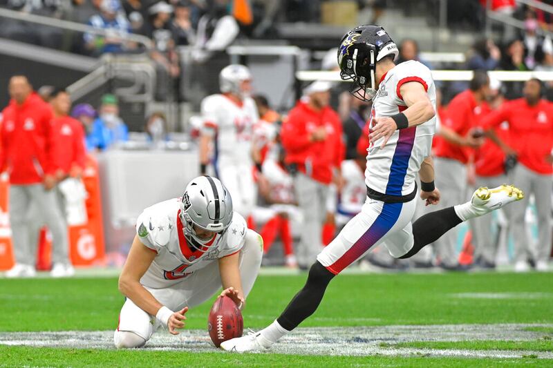 2022 Pro Bowl AFC kicker Justin Tucker of the Baltimore Ravens, right, makes a point-after as AFC punter AJ Cole (6), of the Las Vegas Raiders, holds during the first half of the Pro Bowl NFL football game against the NFC, Sunday, Feb. 6, 2022, in Las Vegas. (AP Photo/David Becker) (David Becker/AP)