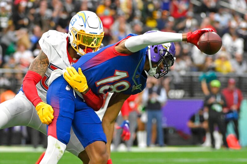 2022 Pro Bowl NFC wide receiver Justin Jefferson (18), of the Minnesota Vikings, is tackled by AFC safety Derwin James (33), of the Los Angeles Chargers, during the first half of the Pro Bowl NFL football game, Sunday, Feb. 6, 2022, in Las Vegas. (AP Photo/David Becker) (David Becker/AP)