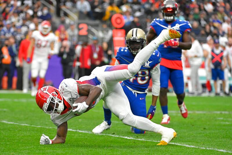 2022 Pro Bowl AFC wide receiver Tyreek Hill, left, of the Kansas City Chiefs, dives for yardage during the second half of the Pro Bowl NFL football game against the NFC, Sunday, Feb. 6, 2022, in Las Vegas. (AP Photo/David Becker) (David Becker/AP)