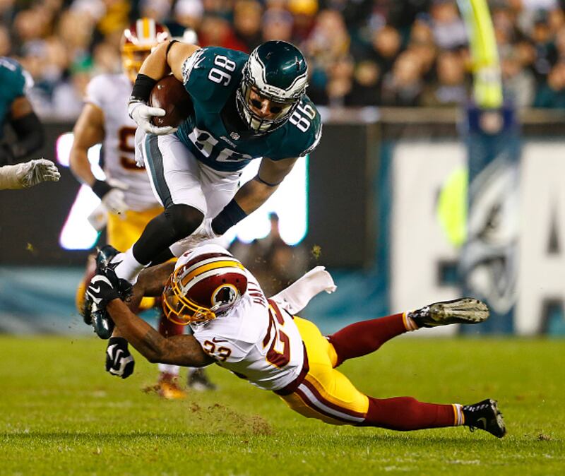 Photos: Zach Ertz through the years 2015: Zach Ertz of the Philadelphia Eagles jumps over DeAngelo Hall of the Washington Redskins after making a catch for a first down in the second quarter of a football game at Lincoln Financial Field on December 26, 2015, in Philadelphia. (Rich Schultz/Getty Images)