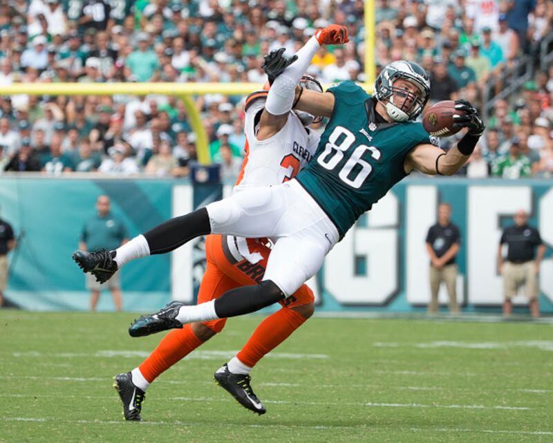 Photos: Zach Ertz through the years 2016: Zach Ertz of the Philadelphia Eagles makes a one-handed catch against Jordan Poyer of the Cleveland Browns in the first quarter at Lincoln Financial Field on September 11, 2016, in Philadelphia. (Mitchell Leff/Getty Images)