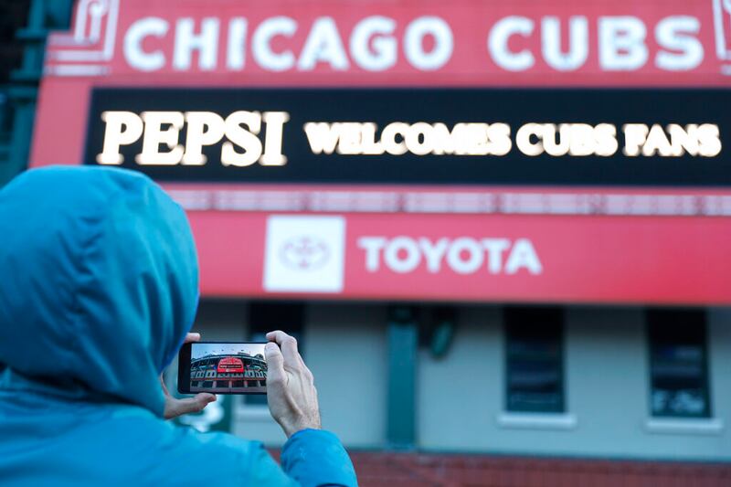 2021 Opening Day A person takes a photo of the Wrigley Field marquee, early morning on the opening day baseball game between the Chicago Cubs and the Pittsburgh Pirates, Thursday, April 1, 2021 at Chicago. From New York to Seattle and everywhere in between, it’s a much different opening day in 2021. Fans are back at the ballpark after they were shut out during the regular season last year because of the coronavirus pandemic. (AP Photo/Shafkat Anowar) (Shafkat Anowar/AP)