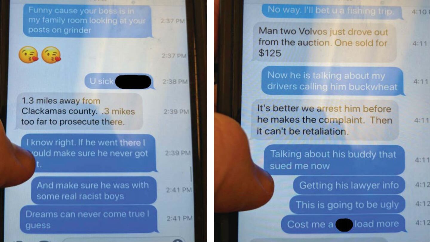 Text messages revealed during discovery in the lawsuit showed Benson and Reeves using racist, homophobic and sexually explicit language as they texted one another. The texts, which are contained in federal court records, show that Benson said he wished Fesser’s arrest would happen in Clackamas County because he wanted to “make sure he was with some real racist boys.”