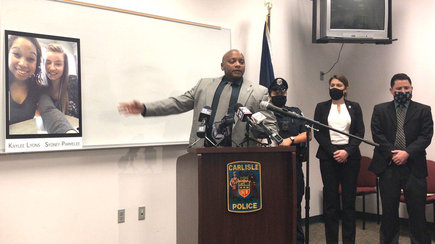 During a news conference on Monday, Carlisle police Chief Taro Landis displayed, front and center, a photo of both victims. He offered their families his condolences on the loss of the women, seen smiling brightly in the photo, which appeared to be a selfie they took together.