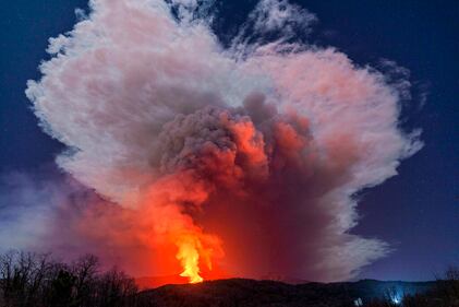 Mt. Etna eruption Smoke fills the sky during an eruption of Mt. Etna volcano, near Catania in Sicily, southern Italy, early Tuesday, Feb. 23, 2021. The explosion started before midnight on Monday night, provoking a huge eruption plume that rose for several kilometers from the top of Etna, as reported by The National Institute of Geophysics and Volcanology, Etneo Observatory. (AP Photo/Salvatore Allegra) (Salvatore Allegra/AP)