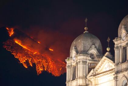 Mt. Etna eruption Lava spews during an eruption of Mt. Etna volcano, near Catania in Sicily, southern Italy, late Monday, Feb. 22, 2021. The explosion started before midnight on Monday night, provoking a huge eruption plume that rose for several kilometers from the top of Etna, as reported by The National Institute of Geophysics and Volcanology, Etneo Observatory. (AP Photo/Salvatore Allegra) (Salvatore Allegra/AP)