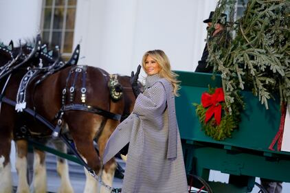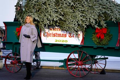 Photos: 2020 White House Christmas tree arrives in Washington, D.C. First lady Melania Trump stands next to the 2020 official White House Christmas tree after it arrived at the White House in Washington, Monday, Nov. 23, 2020. This year's tree is an 18.5-foot Fraser Fir, selected and cut from Dan and Bryan Trees in Shepherdstown, W.Va. (AP Photo/Andrew Harnik)