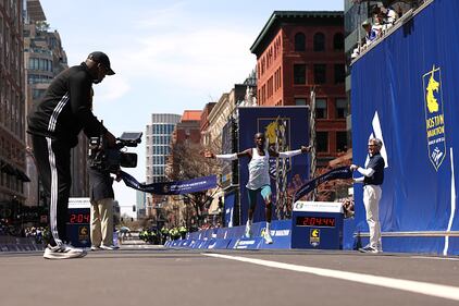 2025 Boston Marathon BOSTON, MASSACHUSETTS - APRIL 21: John Korir of Kenya crosses the finish line to win the 129th Boston Marathon Men's division on April 21, 2025 in Boston, Massachusetts. (Photo by Maddie Meyer/Getty Images) (Maddie Meyer/Getty Images)