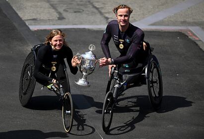 2025 Boston Marathon BOSTON, MASSACHUSETTS - APRIL 21: (L-R) Susannah Scaroni of the United States and Marcel Hug of Switzerland pose with their trophies after winning the 129th Boston Marathon Wheelchair on April 21, 2025 in Boston, Massachusetts. (Photo by Brian Fluharty/Getty Images) (Brian Fluharty/Getty Images)
