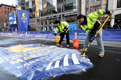 2025 Boston Marathon BOSTON, MASSACHUSETTS - APRIL 21: Workers scrub a painted logo before the 129th Boston Marathon on April 21, 2025 in Boston, Massachusetts. (Photo by Brian Fluharty/Getty Images) (Brian Fluharty/Getty Images)