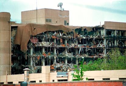 25th anniversary of Oklahoma City bombing Protective covering is draped over the Alfred P. Murrah Federal Building in Oklahoma City after a terrorist bomb killed 168 people. (J. Pat Carter/Getty Images)