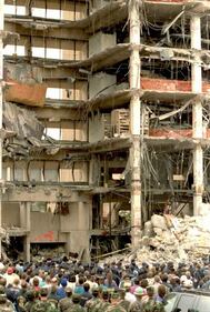 25th anniversary of Oklahoma City bombing Rescue crews and agents from several federal agencies stand in front of the remains of the Alfred P. Murrah after the bombing 25 years ago. (ROBERTO SCHMIDT/AFP via Getty Images)