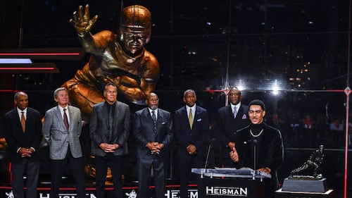 87th Heisman Trophy Ceremony Alabama quarterback Bryce Young speaks after winning the Heisman Trophy at the award ceremony Saturday, Dec. 11, 2021, in New York. (Todd Van Emst/Heisman Trust via AP, Pool)