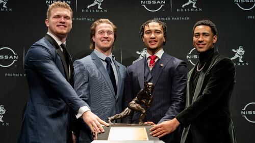 87th Heisman Trophy Ceremony Heisman trophy finalist, from left, Michigan defensive end Aidan Hutchinson, Pittsburgh quarterback Kenny Pickett, Ohio State quarterback C.J. Stroud, and Alabama quarterback Bryce Young stand for a photo with the Heisman Trophy before attending the award ceremony, Saturday, Dec. 11, 2021, in New York. (John Minchillo/AP Photo)