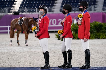 Photos: Bruce Springsteen's daughter Jessica wins Olympic silver in equestrian team jumping United States' Laura Kraut, left, Jessica Springsteen and McLain Ward, right, celebrate winning the silver medal in the equestrian jumping team final at Equestrian Park in Tokyo at the 2020 Summer Olympics, Saturday, Aug. 7, 2021, in Tokyo, Japan. (AP Photo/Carolyn Kaster)
