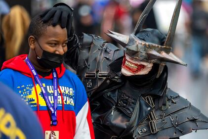 2021 NY Comic Con-Day 2 Attendees meet on the floor of the Jacob K. Javits Convention Center the during New York Comic Con on Friday, Oct. 8, 2021, in New York. (Photo by Charles Sykes/Invision/AP) (Charles Sykes/Charles Sykes/Invision/AP)